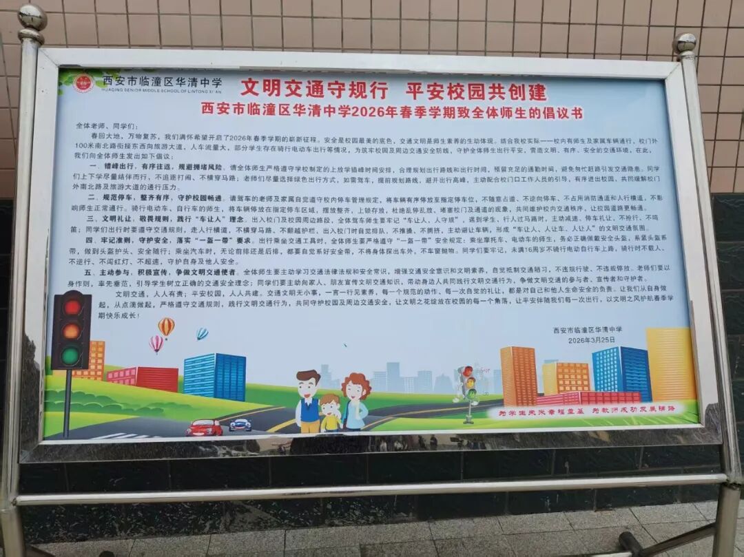 为筑牢校园交通安全防线,增强师生及家长文明出行意识,华清中学2026年春季学期“文明交通、安全出行”主题系列宣传教育实践活动顺利开展。活动覆盖全员、形式丰富、成效突出,营造了“人人守规则、处处讲文明”的良好氛围。