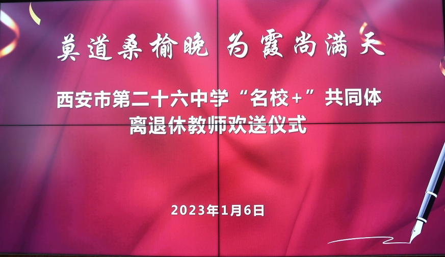 漫漫教育路,回首皆芳华。又是一载流光溢彩,又是一季桃李芬芳。为感谢退休教师为学校发展做出的贡献,传递人文关怀,充分发挥榜样示范引领作用,激励青年教师,2023年1月6日,西安市第二十六中学为即将退休的卓社利、冯志明两位老师举行光荣退休仪式。整个仪式温馨又隆重,流淌涓涓红烛情,涌动浓浓祝福意。
