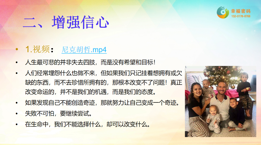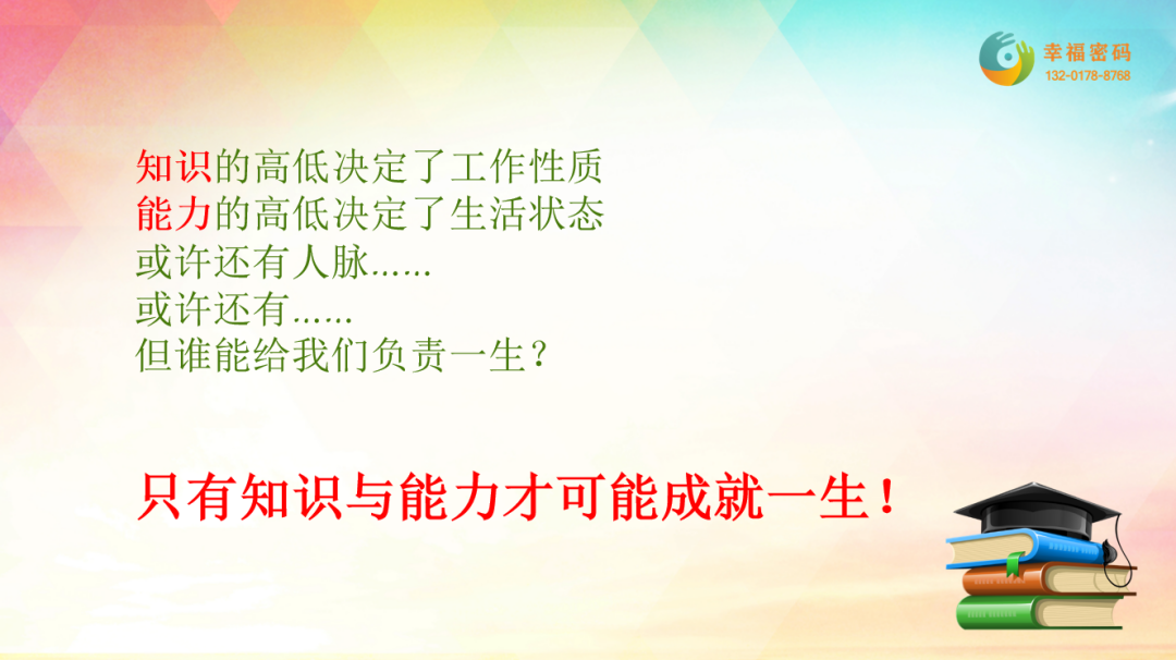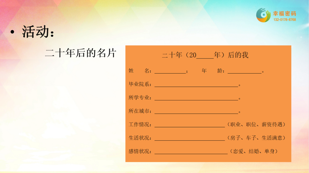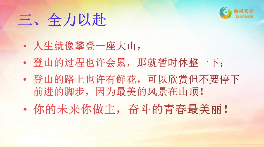 喻老师通过哈佛大学关于“目标对人生影响的跟踪调查”研究,让学生们明白人生目标的重要意义,并引导学生对未来生活进行大胆畅想,告诉学生们“成功始于选择,你选择什么样的目标,就会有什么样的成就,就会有什么样的人生”。