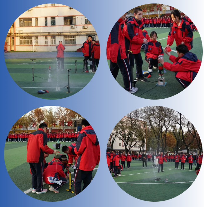 这边飞机还在翱翔天宇,那边水火箭屹立于操场,直刺苍穹!学生们用简单的材料制作出水火箭,在老师的指导下认真操作完成发射。虽然制作过程非常艰难,但在学生们的努力下,一枚枚承载着学生航天梦想的火箭顺利升空。
