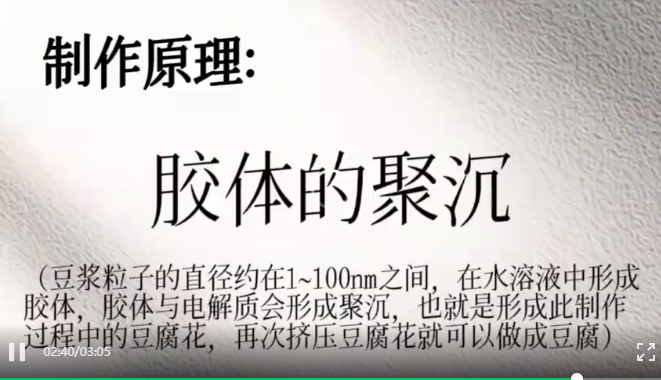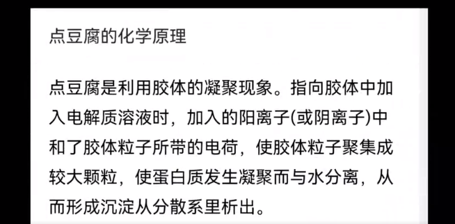 除了答题形式的化学竞赛,西安市第八十五中学还将生活劳动和科技知识的传授完美融合。通过让学生亲身经历豆腐制作的磨豆、煮浆到点卤压制的全过程,体验基层劳动人民的艰辛,学到了和“胶体的聚沉”“胶体凝聚现象”等化学知识。