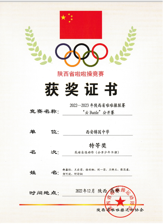 早在2017年,在全国啦啦操联赛总决赛中,西安锦园学校分别荣获学校俱乐部儿童丁组花球规定动作、集体街舞自选动作、集体技巧中级(1-2级)自选动作三个项目的冠军。比赛开幕式上,国家体育总局体操运动管理中心授予西安锦园学校三星级俱乐部的称号,此次三支队伍都获得三个项目的最高荣誉,在全国啦啦操界引起了轰动,推动着陕西啦啦操项目不断前进!